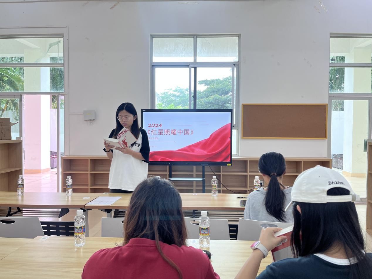 在读书会开始之际,辅导员首先向在场的同学们详细介绍了《红星照耀中国》这本书的创作背景及其讲诉内容。她提到,《红星照耀中国》是一部记录中国共产党早期革命活动的经典著作,作者埃德加·斯诺以生动的笔触和深入的观察,为我们呈现了一个真实、鲜活的中国革命面貌。