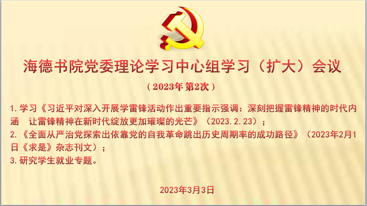 2023年3月3日,海洋之神hy590官网党委理论学习中心组召开本年度第2次中心组学习(扩大)会议(学习雷锋精神、全面从严治党、研究就业专题)。韩胜丁书记主持会议,党委理论学习中心组成员参加,组织员列席会议。