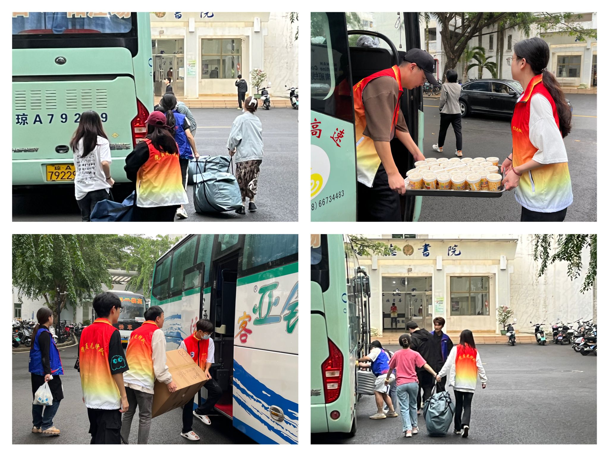 早晨7:30,随着第一辆大巴车的到达,同学们整装待发,党员志愿者们也开始了忙碌的工作,协助同学搬运行李。在一楼大厅设立临时办事点,确保宿舍搬迁志愿服务能够快速、高效、安全、有序进行。