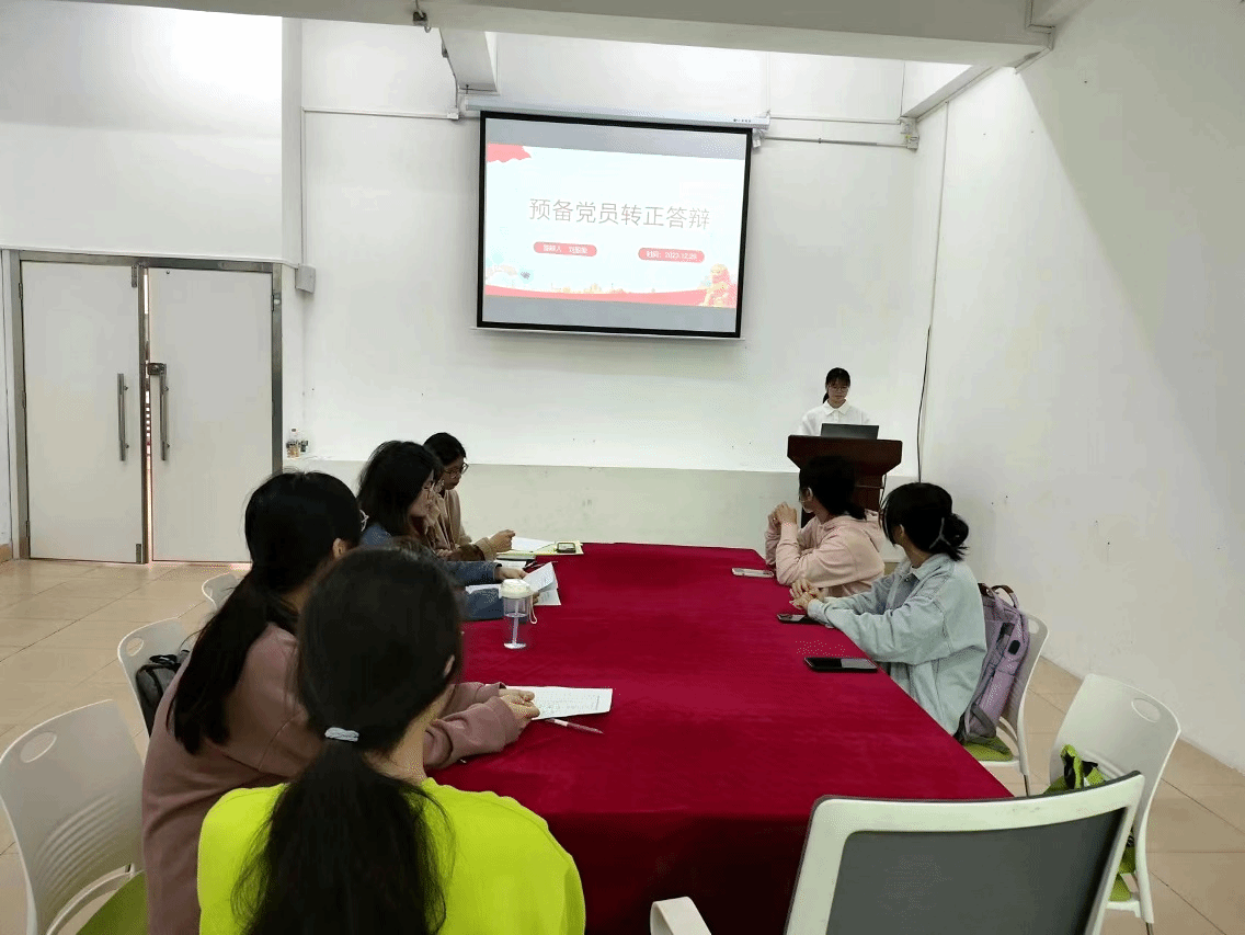 会议伊始,刘盈盈同志汇报了其在一年预备期中思想、学习、生活以及工作上各方面的情况,表达了成为优秀党员的决心。随后,支委周倩和徐智慧同志介绍了刘盈盈同志在预备期间表现情况,认为刘盈盈同志符合按期转正要求。答辩评审小组就党的基本理论知识,如何深入群众中去,以及如何理论联系实际,深入了解刘盈盈同志的党性修养,并进行现场讨论评议,充分发表意见。与会党员经过充分讨论,以无记名投票方式表决通过了刘盈盈同志的转正申请。